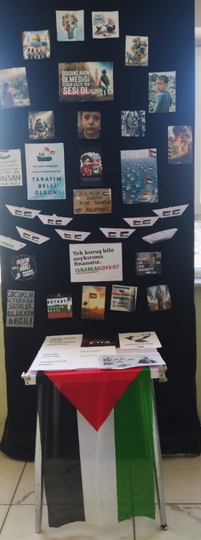 50.Yıl İlk ve Ortaokulu öğretmenleri, Filistin’de yaşananlara dikkat çekmek ve öğrencilerde barışın önemine dair farkındalık oluşturmak amacıyla anlamlı bir pano hazırladı.